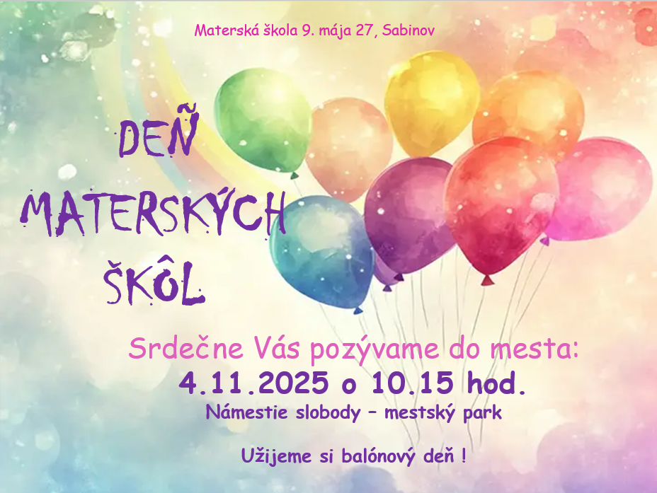 - Milí rodičia,- aj tento rok sa naša materská škola, spolu so všetkými materskými školami v Sabinove, v spolupráci so Školským úradom a primátorom mesta Sabinov, Ing. Michalom Repaským, zapojí do krásnej oslavy – Dňa materských škôl. - Toto milé podujatie sa už tradične koná v centre mesta – v parku pred Mestským úradom v Sabinove, a srdečne vás naň pozývame v utorok 4. novembra. Deň materských škôl je sviatkom všetkých detí, učiteliek i materských škôl na Slovensku. - Tešíme sa na spoločné chvíle plné detskej radosti, hudby a smiechu – lebo práve deti sú tým najkrajším dôkazom, že naša práca má zmysel.